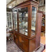 Ashley Furniture Cherry China Cabinet, two piece, light with hinge touch for lights, mirrored back, glass shelves, good condition, 82″h., 58″w., 18″d door does not close fully