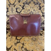 Has locking mechanism w no key. Small carrying handle. 3 divided interior compartments. Durable leather. Wear to interior.
